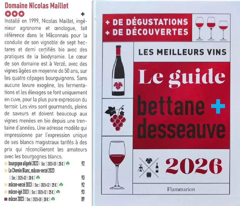 Le MACON VERZE BLANC 2001 et le MACON VERZE BLANC « Le chemin blanc », par le guide BETTANE ET DESSEAUVE 2004.